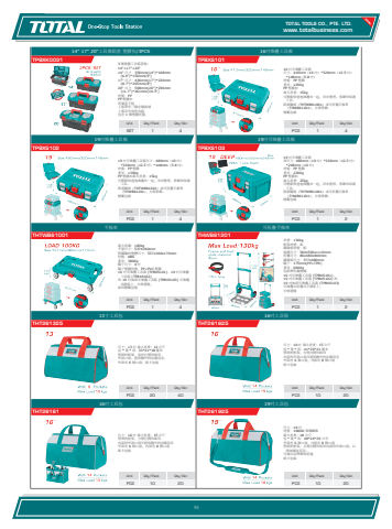 www.totalbusiness.comTOTAL TOOLS CO., PTE. LTD.www.totaltools.cn 01Unit Qty/Pack Qty/CtnPCS 10 2019吋工具包THT261925尺寸:19 吋 材質:1680D 聚酯纖維 最大承重:18 公斤 長 * 寬 * 高:48*24*29 公分 外部有 6 個口袋,內部有 8 個口袋 堅固的框架,方便打開和使用內部和外部口袋,以增加儲存容量。 可調式肩帶確保舒適 紙卡包裝Unit Qty/Pack Qty/CtnPCS 10 2016吋工具包THT26161尺寸:16 吋 最大負重:15 公斤 堅固的框架,方便打開和取用 內部和外部口袋可提供額外的存儲容量 外部有 6 個口袋,內部有 8 個口袋 紙卡包裝Unit Qty/Pack Qty/CtnPCS 10 2016吋工具袋THT261625尺寸:16 吋 最大承重:15 公斤 長 * 寬 * 高:41*29*21 釐米 堅固的框架,方便打開和取用 內部和外部口袋可提供額外的存儲容量 外部有 6 個口袋,內部有 8 個口袋 紙卡包裝Unit Qty/Pack Qty/CtnPCS 20 4013寸工具包THT261325尺寸:13 吋 最大承重:12 公斤 長 * 寬 * 高:33*21*18 釐米 堅固的框架,易於打開和取用 外部口袋,提供額外的存儲容量, 外部有 6 個口袋,紙卡包裝Unit Qty/Pack Qty/CtnPCS 1 2可折疊手推車THWB61201承重:130kg 框架材質:鋁 腳踏板材質:鋁 展開尺寸:560x506x1110mm 折疊尺寸:86x480x840mm 腳踏板尺寸:377x480mm 輪子:175mm(PP+TPR) 重量:6600g 包括彈性蹦極繩 16 吋可堆疊工具箱 (TPBXS101)、 19 吋可堆疊工具箱 (TPBXS102) 和 19 吋加深可堆疊工具箱 (TPBXS103) 可堆疊在折疊式手推車上, 方便運輸 Unit Qty/Pack Qty/CtnPCS 1 4平板車THTWB61001最大負載:100kg 平臺尺寸:537X360mm 附腳輪的整體尺寸:537x360x170mm 材質:ABS 重量:3800g 輪子尺寸:4 吋 輪子塑膠材質:PP+PVC 塑膠 16 吋可堆疊工具箱 (TPBXS101)、19 吋可堆疊工具箱 (TPBXS102) 和 19 吋加深可堆疊工具箱 (TPBXS103) 可堆疊在捲板上,方便運輸, 採用標籤包裝Unit Qty/Pack Qty/CtnPCS 1 219吋可堆疊工具箱TPBXS10319 吋可堆疊工具箱 深尺寸:480mm(19 吋)*320mm(12.5 吋)*248mm(10 吋) 材質:PP 塑膠重量:2200g PP 塑膠扣最大承重:25kg 可輕鬆快速地堆疊在一起,旨在整理、移動和保護工具。 附滾輪板(THTWB61001)或可折疊手推車(THWB61201),方便移動。 標籤包裝Unit Qty/Pack Qty/CtnPCS 1 419吋堆疊工具箱TPBXS10219 吋可堆疊工具箱尺寸:480mm(19 吋)*320mm(12.5 吋)*148mm(5.8 吋) 材質:PP 塑膠重量:1390g PP 塑膠扣最大承重:15kg 可輕鬆快速地堆疊在一起,旨在整理、移動和保護工具。 附滾輪板(THTWB61001)或可折疊手推車(THWB61201),方便移動。 標籤包裝Unit Qty/Pack Qty/CtnPCS 1 416吋堆疊工具箱TPBXS10116 吋可堆疊工具箱 尺寸:410mm(16 吋)*320mm(12.5 吋)*148mm(5.8 吋) 材質:PP 塑膠重量:1290g PP 塑膠扣最大承重:15kg 可輕鬆快速地堆疊在一起,旨在整理、移動和保護工具。 附滾輪板(THTWB61001)或可折疊手推車(THWB61201),方便移動。 標籤包裝Unit Qty/Pack Qty/CtnSET 1 414\TPBXK0031 3 個塑膠工具箱套裝: 14\14\(6.6\17\(8.7\20\(11.7\材質:PP PP 塑膠扣 高強度手柄 上蓋帶有三個存儲區域 上蓋具有刻度功能 包含 1 個塑膠托盤 91