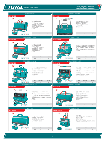 www.totalbusiness.comTOTAL TOOLS CO., PTE. LTD.www.totaltools.cn 01Unit Qty/Pack Qty/CtnPCS 1 220\THRRTB2012尺寸:20 吋 材質:600D 與 1680D 聚酯及防潮材質 最大承重:20kg 附輪式伸縮把手 長 * 寬 * 高:45*28*36cm 帶有 5 個外部口袋和多個內部剛性框架,方便打開和取用,並採用紙卡包裝Unit Qty/Pack Qty/CtnPCS 3 624吋工具包THT16241尺寸:24 吋 最大負重:25 公斤 堅固的框架,方便打開和取用; 強化塑膠底座,經久耐用; 內部口袋,提供額外的存儲容量; 包含可調節肩帶;紙卡包裝Unit Qty/Pack Qty/CtnPCS 4 8塑鋼硬底工具包/24\THT16242尺寸:24 吋 材質:600D 和 1680D 聚酯纖維 最大承重:25kg 長 * 寬 * 高:60*23*35cm 堅固的框架,方便打開和取用; 強化塑膠底座,經久耐用; 內部口袋,提供額外的存儲容量; 包含可調節肩帶; 紙卡包裝Unit Qty/Pack Qty/CtnPCS 2 4硬鋼管塑鋼硬底工具包%u0012%u0014%u0019ļTHT66L01尺寸:16 英寸,14 個工具袋,雙面開口,可容納所有工作站, 材質:600D 聚酯纖維和防潮材料,最大承重:20 公斤, 長 * 寬 * 高:42*24*33 釐米柔軟的襯墊手柄,舒適耐用; 堅固的鋼製手柄和肩帶,方便攜帶;堅固的增強塑膠底座; 紙卡包裝。Unit Qty/Pack Qty/CtnPCS 1 416\THT66L12尺寸:16 英寸,14 個工具袋,雙面開口,可容納所有工作臺, 材質:1680D 聚酯纖維和防潮材料,最大承重:20 公斤, 長 * 寬 * 高:42*24*33 釐米柔軟的襯墊手柄,舒適耐用; 堅固的鋼製手柄和肩帶,方便攜帶; 堅固的增強塑膠底座;紙卡包裝。Unit Qty/Pack Qty/CtnPCS 2 4大型塑鋼硬底工具包%u0012%u0014%u0019ļTHT56161尺寸:16 吋 25 工具袋 圓形頂部幾何 材質:600D 聚酯纖維 最大承重:20 公斤 長 * 寬 * 高:46*23*33 釐米 強化塑膠底座,耐用 內部口袋,提供額外儲存容量 包含可調式肩帶 紙卡包裝Unit Qty/Pack Qty/CtnPCS 1 416\THT561625尺寸:16 英寸,25 個工具袋,圓形頂部幾何結構, 材質:600D 和 1680D 滌綸,最大承重:20 公斤, 長 * 寬 * 高:46*23*33 釐米,強化塑膠底座,耐用 內部口袋,提供額外儲存容量,包含可調式肩帶,紙卡包裝。Unit Qty/Pack Qty/CtnPCS 1 416\THT36L03尺寸:16 吋 7 個工具袋 材質:1680D 聚酯纖維 最大承重:15 公斤 長 * 寬 * 高:41*23*22 釐米 柔軟的襯墊手柄,舒適耐用; 堅固的鋼製手柄,方便攜帶; 堅固的增強塑膠底座; 紙卡包裝Unit Qty/Pack Qty/CtnPCS 5 10塑鋼硬底工具包/16\THT16161尺寸:16 吋 最大負重:20 公斤 堅固的框架,方便打開和取用; 強化塑膠底座,經久耐用; 內部口袋,提供額外的存儲容量; 包含可調節肩帶; 紙卡包裝Unit Qty/Pack Qty/CtnPCS 5 1016\THT16163尺寸:16 吋 材質:1680D 聚酯纖維 最大承重:20 公斤 長 * 寬 * 高:41*25*26 釐米 堅固的框架,方便打開和取用; 強化塑膠底座,經久耐用; 內部口袋,提供額外的存儲容量; 包含可調節肩帶; 紙卡包裝92