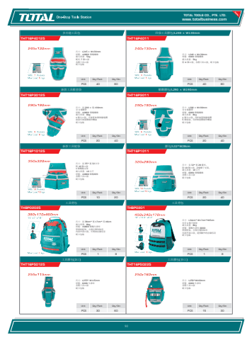www.totalbusiness.comTOTAL TOOLS CO., PTE. LTD.www.totaltools.cn 01Unit Qty/Pack Qty/CtnPCS 15 30工具腰包(多口)THT16P50225尺寸:L250*W160mm 材質:600D 牛津布 各種工具口袋 紙卡包裝Unit Qty/Pack Qty/CtnPCS 30 60工具腰包(3口)THT16P50125尺寸:L255* W115mm 材質:600D 牛津布 各種工具口袋 紙卡包裝Unit Qty/Pack Qty/CtnPCS 1 8工具背包THBP0201尺寸:L34cm* W17cm*H45cm 內含 1 個手提袋 最大承重:8kg 材質:聚酯牛津布 600D 堅固框架,方便打開和取用 內部外部口袋,提供額外的存儲容量 紙卡包裝Unit Qty/Pack Qty/CtnPCS 1 8工具背包THBP02025尺寸:長 38cm* 寬 17cm* 高 46cm 最大承重:8kg 材質:1680D 聚酯牛津布 堅固的框架,方便打開和取用 內部外部口袋,可增加存儲容量 紙卡包裝Unit Qty/Pack Qty/CtnPCS 20 40腰包/L32*W28cmTHT16P1011尺寸:長 32* 寬 28 釐米, 附 10 個口袋,2 個錘子支架, 最大承重:10 公斤 材質:600D 聚酯纖維 各種工具口袋 紙卡包裝Unit Qty/Pack Qty/CtnPCS 10 20新款工具槌袋THT16P10125尺寸:長 35* 寬 32 公分 附 10 個口袋 1 個鐵鎚支架 最大承重:10 公斤 材質:1680D 聚酯纖維 各種工具口袋 紙卡包裝Unit Qty/Pack Qty/CtnPCS 20 40槍鑽腰包/L290 × W190mmTHT16P3011尺寸:L290 × W190mm 含 1 條腰帶 材質:600D 聚酯纖維 最大承重:8kg 1 個大口袋,用於放置無線電鑽 5 個前袋,用於放置鑽頭和螺絲 紙卡包裝Unit Qty/Pack Qty/CtnPCS 20 40新款工具槍套袋THT16P30125尺寸:長 290 × 寬 190mm 含 1 條腰帶 材質:1680D 聚酯纖維 最大承重:8kg 1 個大口袋,可放置 9 個無線電鑽 前袋可放置鑽頭和螺絲 紙卡包裝Unit Qty/Pack Qty/CtnPCS 40 80四袋工具腰包/L240 × W130mmTHT16P4011尺寸:L240 × W130mm 材質:600D 聚酯纖維 最大承重:5kg 附 4 個口袋,各種工具口袋,紙卡包裝Unit Qty/Pack Qty/CtnPCS 40 80多功能工具包THT16P40125尺寸:L245 × W130mm 材質:1680D 聚酯纖維 最大承重:5kg 配有 7 個口袋 各種工具口袋 紙卡包裝93